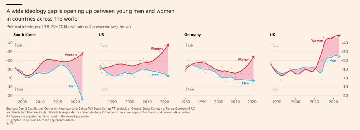 Few places make the division more legible than South Korea, where the April 2024 general election turned gender into open political warfare. According to Gallup Korea, men in their twenties backed conservative parties at rates above 40%, with some polling even higher among those who supported abolishing the Gender Equality Ministry, a key symbolic institution. Women in the same age bracket, by contrast, voted overwhelmingly for progressive parties, not out of broad ideological loyalty, but in direct response to what they viewed as an explicit assault on their rights, dignity, and presence in public life. The resulting 30-point gap wasn’t a statistical fluke; it was a statement of separation.